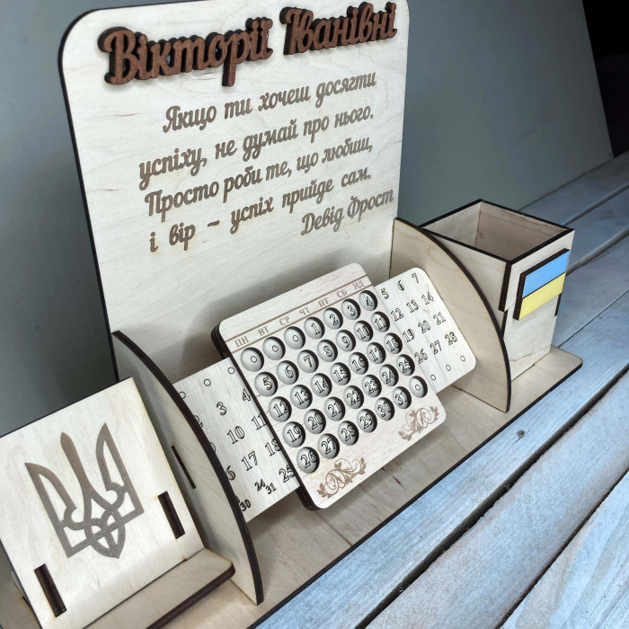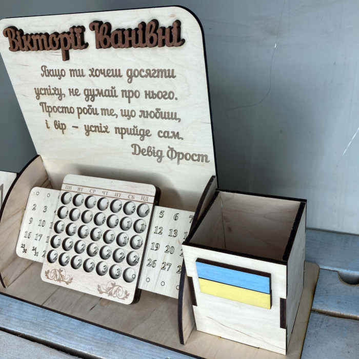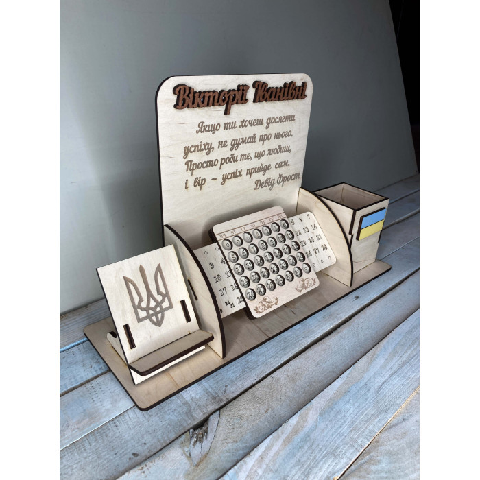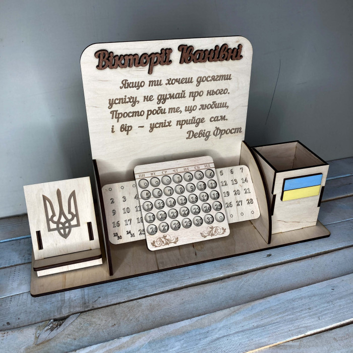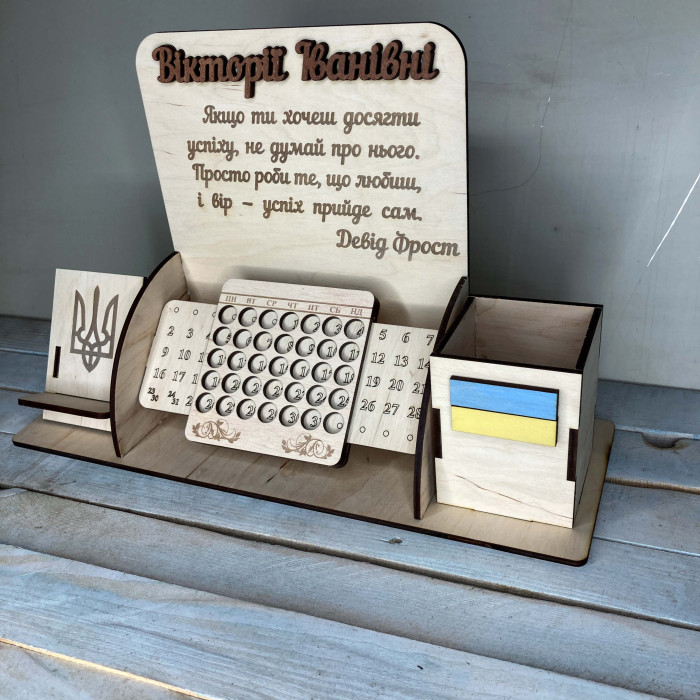 Органайзер виготовляється з натурального дерева високої якості та доповнюється індивідуальним гравіюванням: ім’ям вчителя, назвою класу, датою або щирими словами подяки. Продумана конструкція дозволяє зручно розмістити телефон, ручки, блокнот, окуляри та інші необхідні речі.