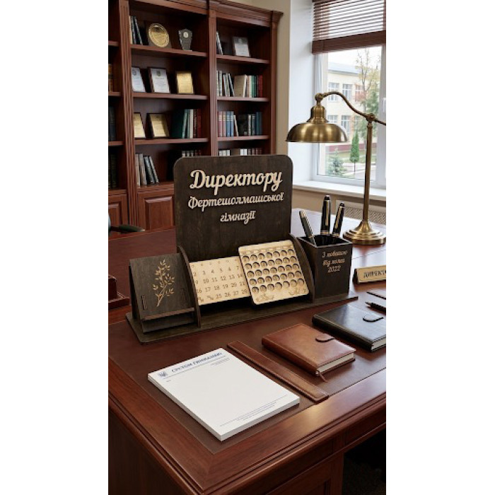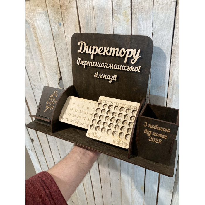 Іменний органайзер для директора школи / гімназії з вічним календарем HWD-OR010 — це виріб, який поєднує індивідуальність, практичність та емоцію подарунка. Він підходить для свят, подяк, корпоративних привітань і персональних замовлень.