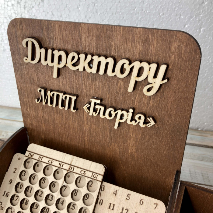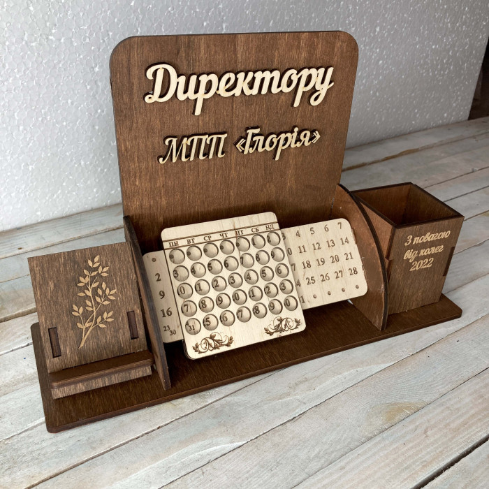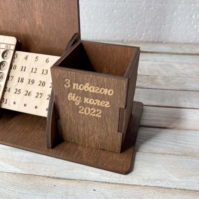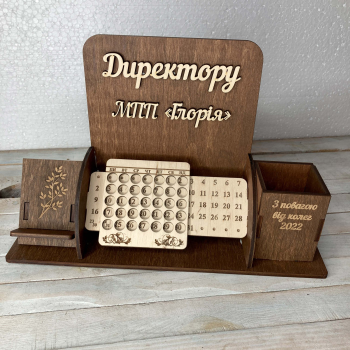 Іменний органайзер з дерева з вічним календарем — це статусний, практичний та оригінальний подарунок директору, який підкреслює повагу, вдячність і високий статус отримувача.