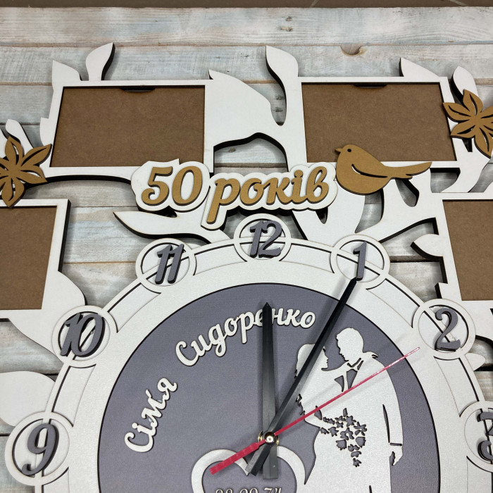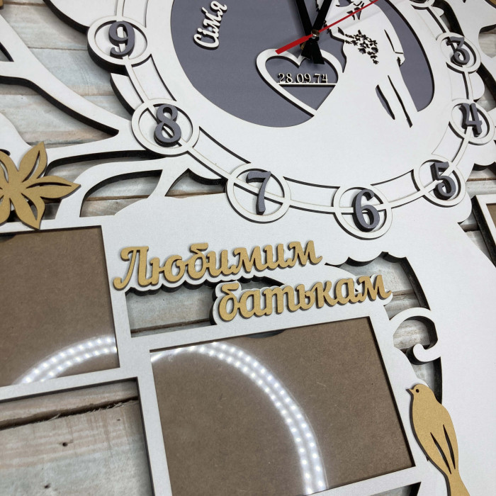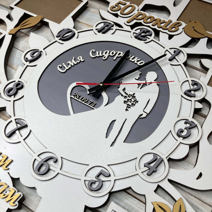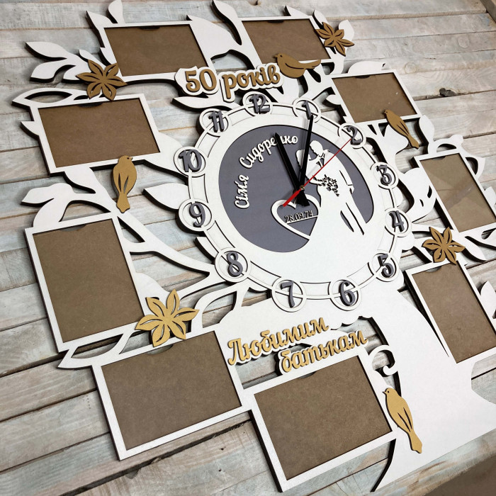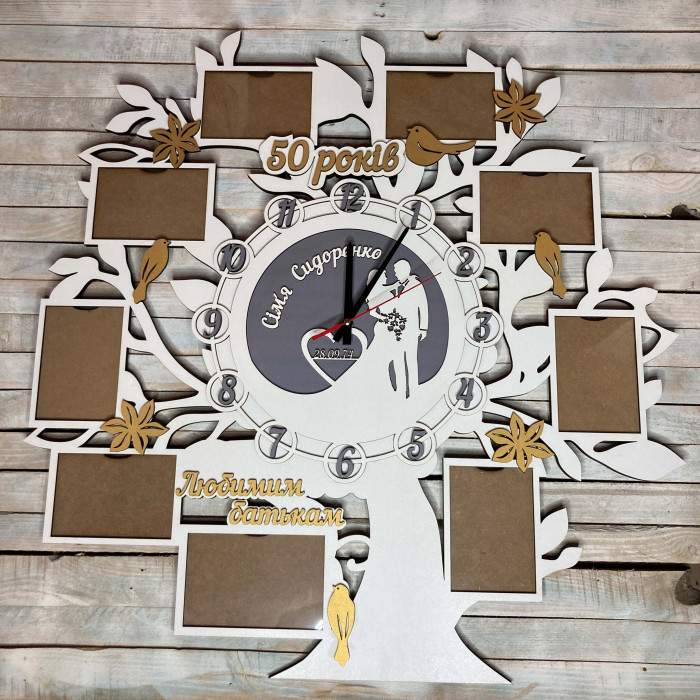 Часы в виде семейного дерева с фоторамками — это символ любви, семьи и памяти. Такой подарок станет трогательным сюрпризом для родителей на юбилей или годовщину свадьбы.