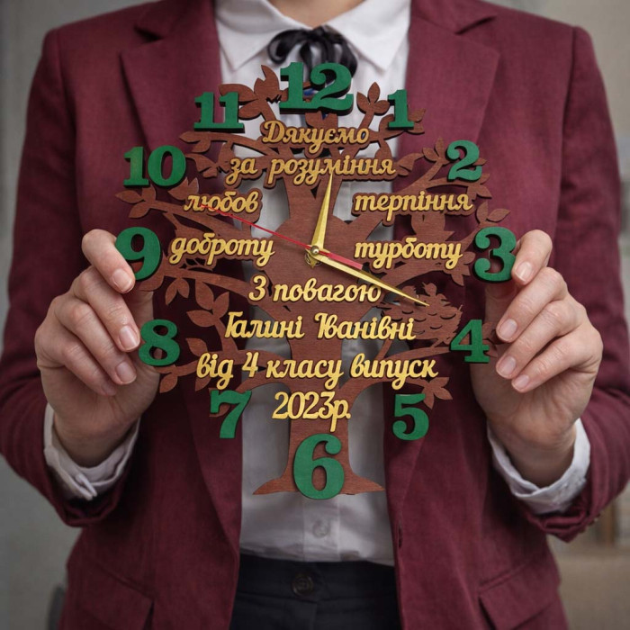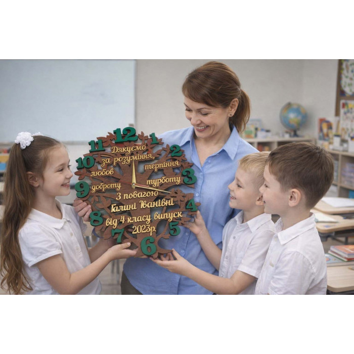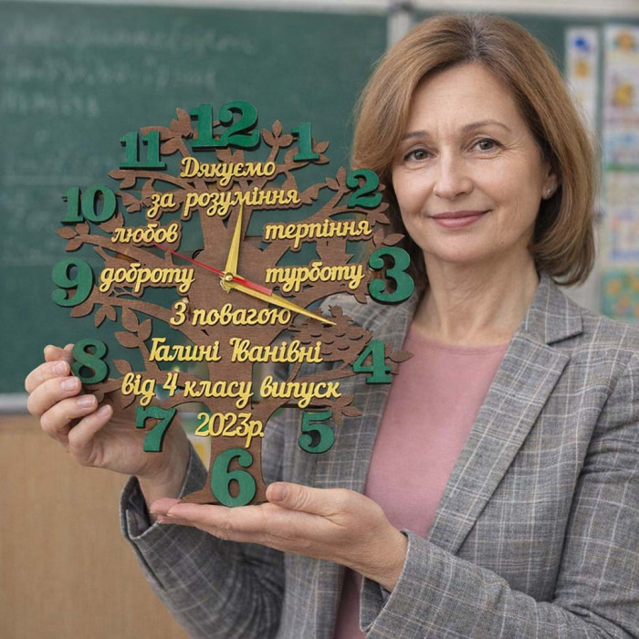 В цену часов входят изменения текста (имя отчество учителя, и от кого). Слова с пожеланиями остаются как на макете. Возможен вариант часов на русском языке.